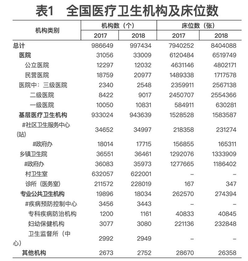 5月22日,國家衛(wèi)生健康委發(fā)布《2018年我國衛(wèi)生健康事業(yè)發(fā)展統(tǒng)計(jì)公報(bào)》(下稱《公報(bào)》)。數(shù)據(jù)顯示,2018年末,全國醫(yī)療衛(wèi)生機(jī)構(gòu)總數(shù)達(dá)997434個(gè),其中醫(yī)院33009個(gè)。